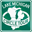 Señal que destaca una ruta panorámica cerca del lago Michigan. Es ideal para quienes buscan paisajes únicos mientras conducen.